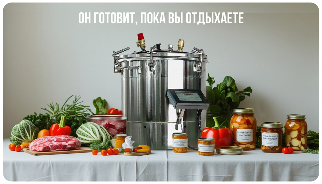 Объём 22 литра позволяет загружать до 18 банок по 0,5 л или 6 банок по 1 л за один цикл. Удобно работать как со стандартными стеклянными банками, так и с жестяными консервными банками и реторт-пакетами. Это даёт возможность делать универсальные заготовки: от мясных тушёнок до соков, овощных салатов и компотов.