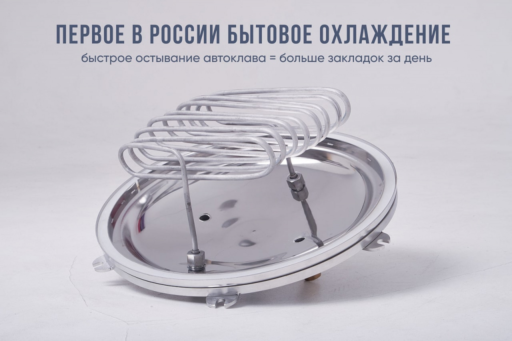 Вместе с автоклавом, вы получаете устройство для быстрого охлаждения автоклава, которое позволяет ещё быстрее охладить воду внутри автоклава. Это особенно удобно, если вы готовите в реторт пакетах. Новую партию можно будет загрузить ещё быстрее.