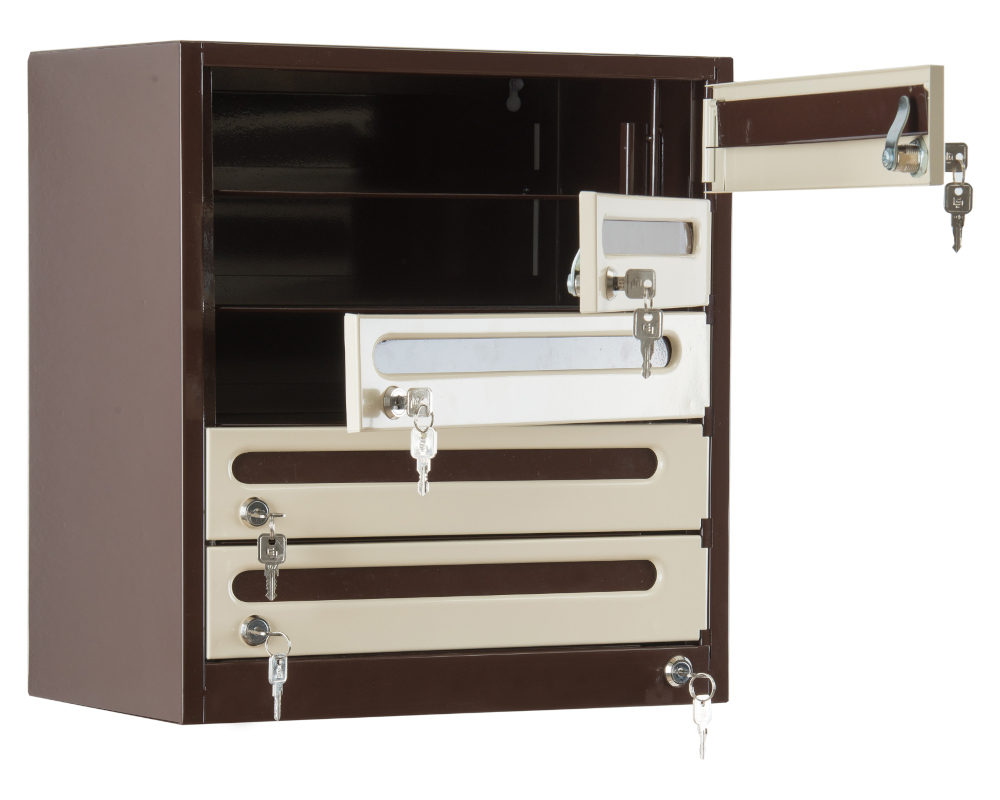 • Оснащен сервисным ключом, который является блокировочным механизмом - все ячейки открываются/закрываются одновременно. Замок расположен в нижнем правом углу ящика. Сервисный ключ находится у почтальона, работника ЖКХ, консьержа.