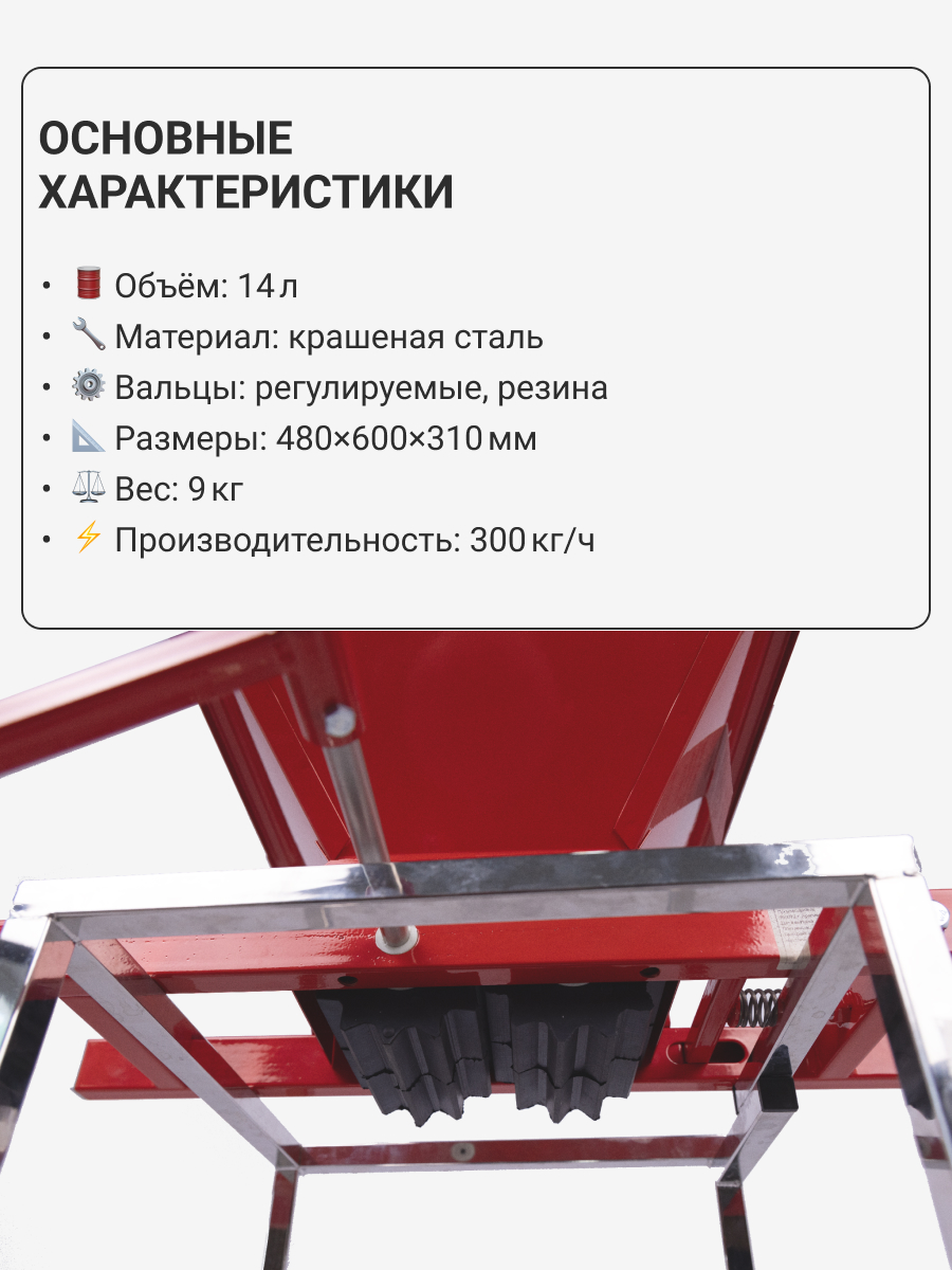 • Регулируемые вальцы из высококачественной пищевой резины, что обеспечивает качественное разминание ягоды без дробление виноградной косточки.