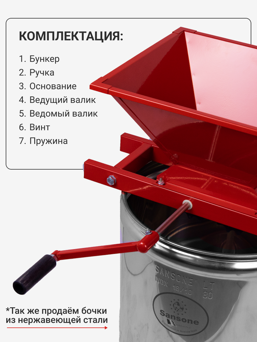 • С помощью регулировки удобно меняется степень прижатия вальцов, что отражается на качестве размятия винограда.
