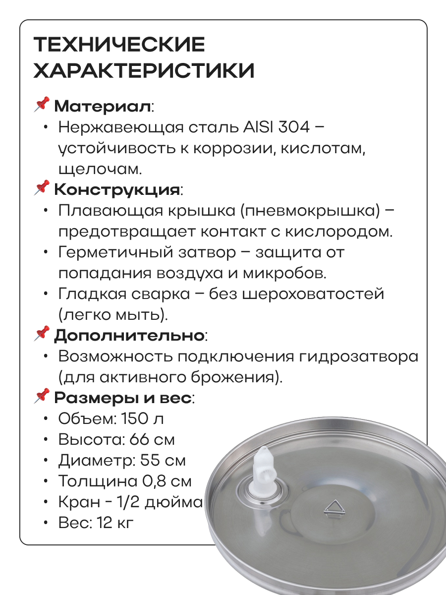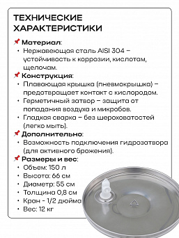 Емкость с пылезащитной и пневматической (плавающей) крышкой из пищевой нержавеющей стали. Подходит для бурного брожения (первичное), для тихого брожения (вторичное) и для длительного хранения (созревания продукта).