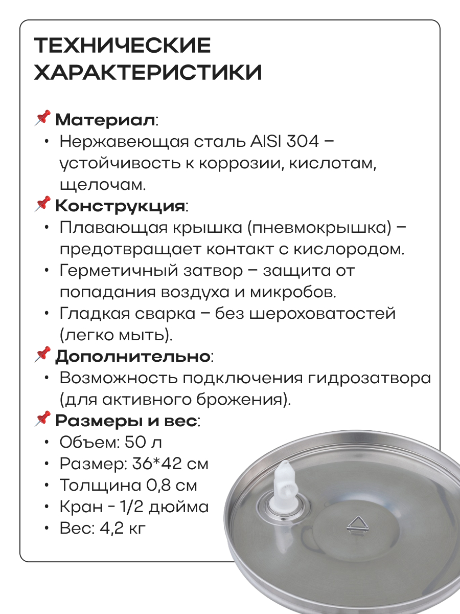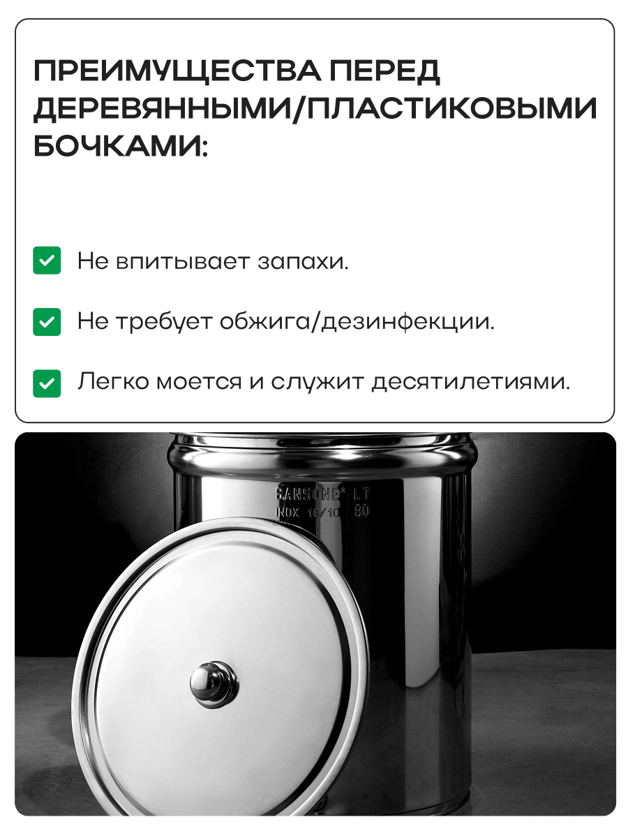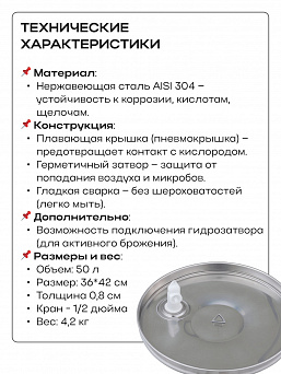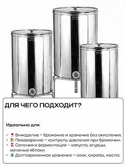 Емкость с пылезащитной и пневматической (плавающей) крышкой из пищевой нержавеющей стали. Подходит для бурного брожения (первичное), для тихого брожения (вторичное) и для длительного хранения (созревания продукта).