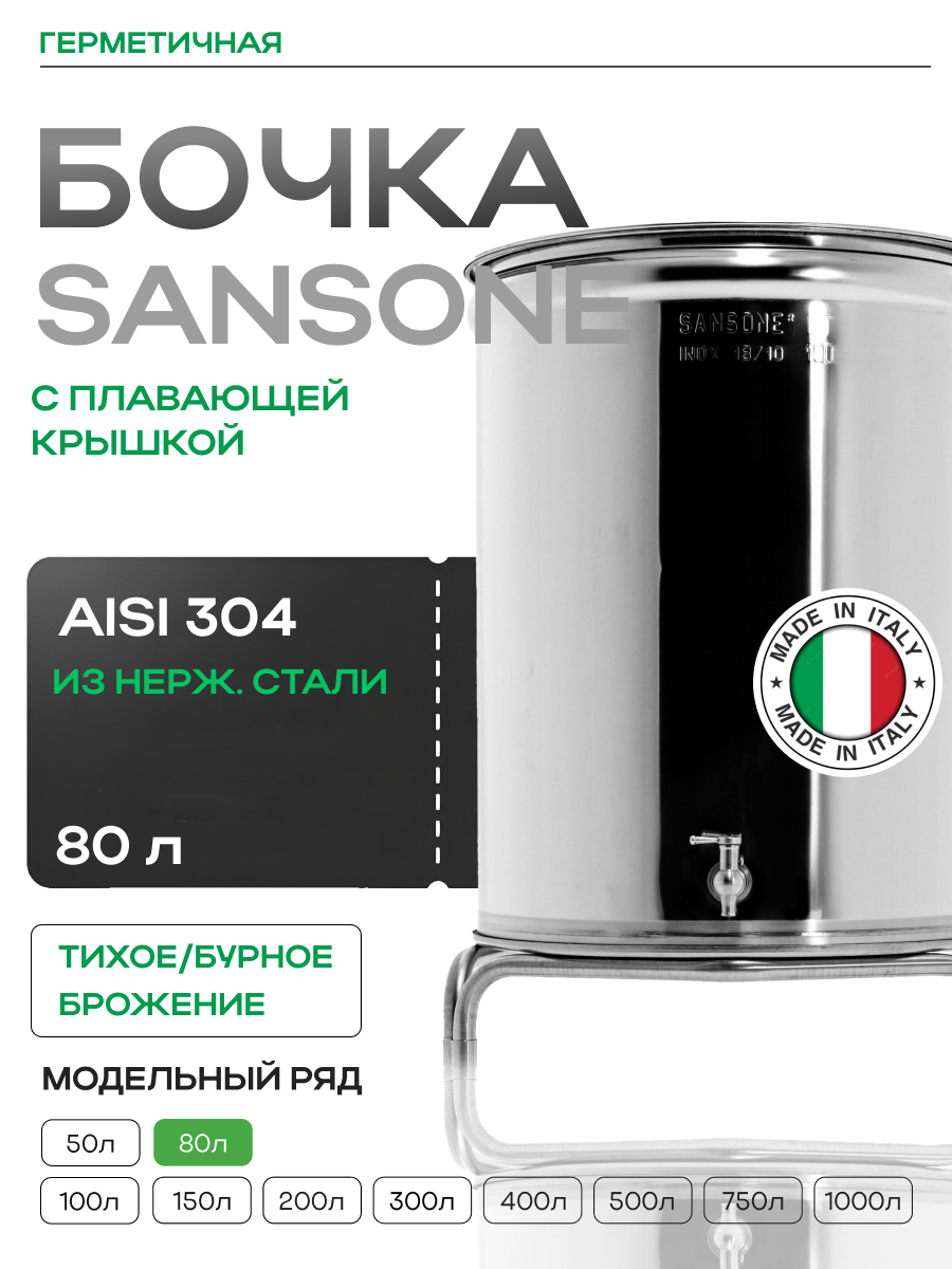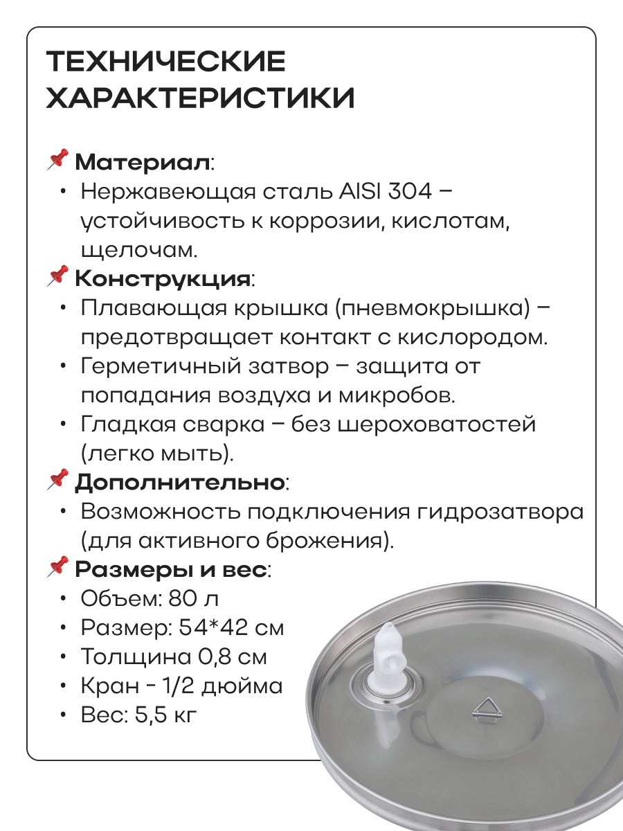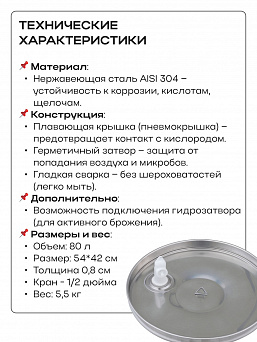 Емкость с пылезащитной и пневматической (плавающей) крышкой из пищевой нержавеющей стали. Подходит для бурного брожения (первичное), для тихого брожения (вторичное) и для длительного хранения (созревания продукта).