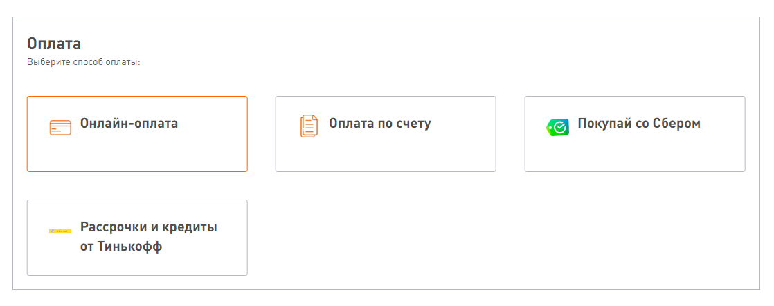 В зависимости от индивидуальных предпочтений и возможностей мы предлагаем несколько способов оплаты товара: онлайн, по счету, в рассрочку или кредит.