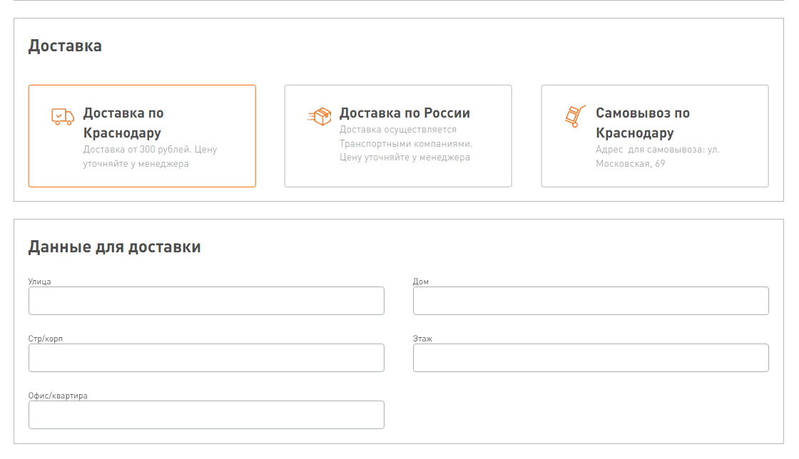 - Если вам нужна доставка по Краснодару или по России, необходимо обязательно указать адрес. Если вы выбрали «Самовывоз», то адрес можно не вносить.