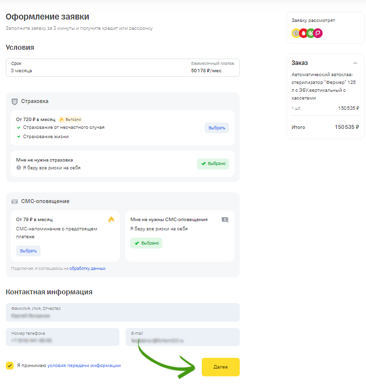 Далее вы перейдете на страницу оформления заявки, где необходимо заполнить условия, контактную информацию.